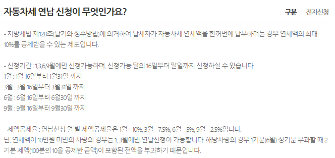 안녕하세요. 오늘 소개할 내용은 자동차연납 신청입니다. 자동차세를 한번에 모두 납부할 경우 최대 10%를 공제받을 수 있는 제도를 말합니다.