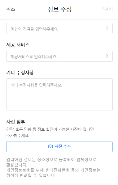 요청할수 있는 정보는 상호변경. 위치. 업종. 전화번호(복수등록가능). 홈페이지정보. 메뉴. 가격. 기타수정사항 마지막으로 사진첨부가 가능합니다.