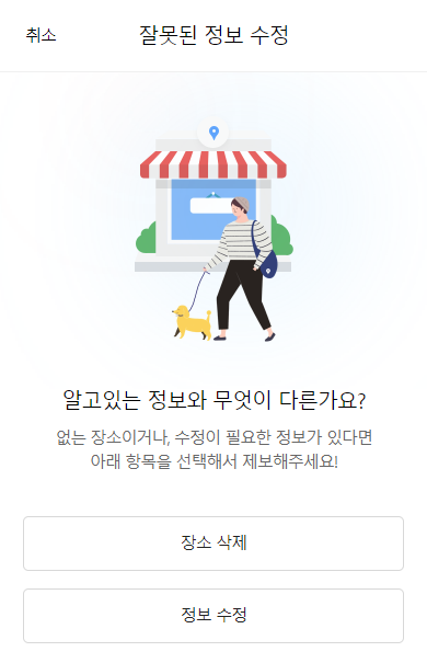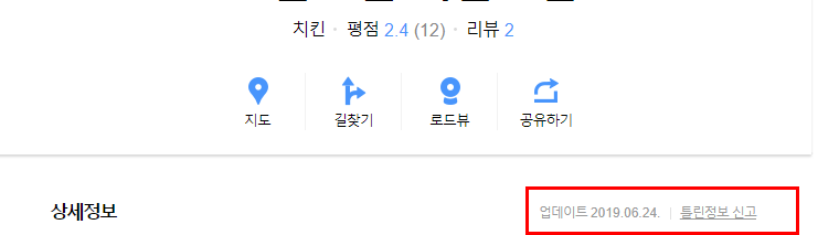 그리고 수정을 원하는 본인의 지도정보로 이동합니다. 그럼 위 이미지와 같은 "틀린정보 신고" 버튼이 있습니다.