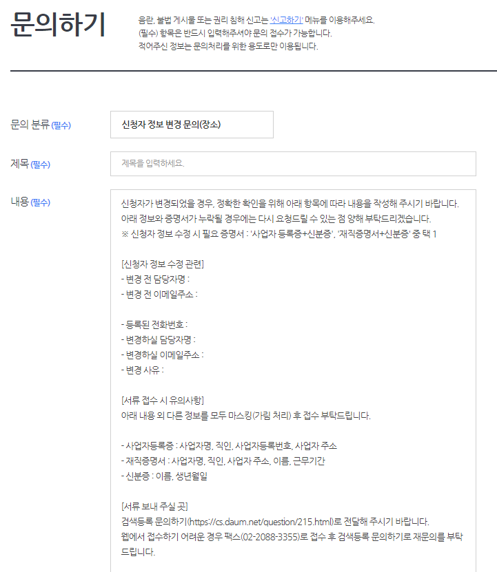 문의분류에서 신청자 정보 변경 문의(장소)를 선택하시면 입력항목이 나옵니다. 기존 담당자를 알고 있다면 기존 담당자명. 메일주소를 입력하고 권한을 받으려는분 정보. 사업자등록증. 신분증을 첨부하여 제출하시면 됩니다.